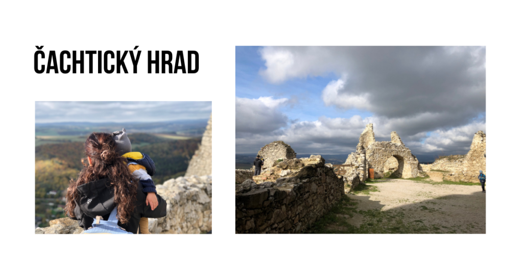 TIP NA VÝLET: Vydali jsme se na Čachtický hrad. Parkovat můžete buď na placeném parkovišti cca 1km od hradu nebo ještě kousek níže podél cesty na místech k tomu určených. My jsme to kvůli karavanu dali níž a nahoru si vyšlápli s kočárem po asfaltové cestě. Jen samotný konec už mírný terén, ale nic, co by klasický kočár nezvládnul.